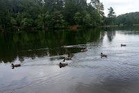 After lunch we decided to go to the park. We walked around the lake and saw all kinds of interesting things - a salamander, caterpillars, ants, ducks, dragonflies, and small fish. We played on the playground for a little while, and picked flowers in the adjacent open field.